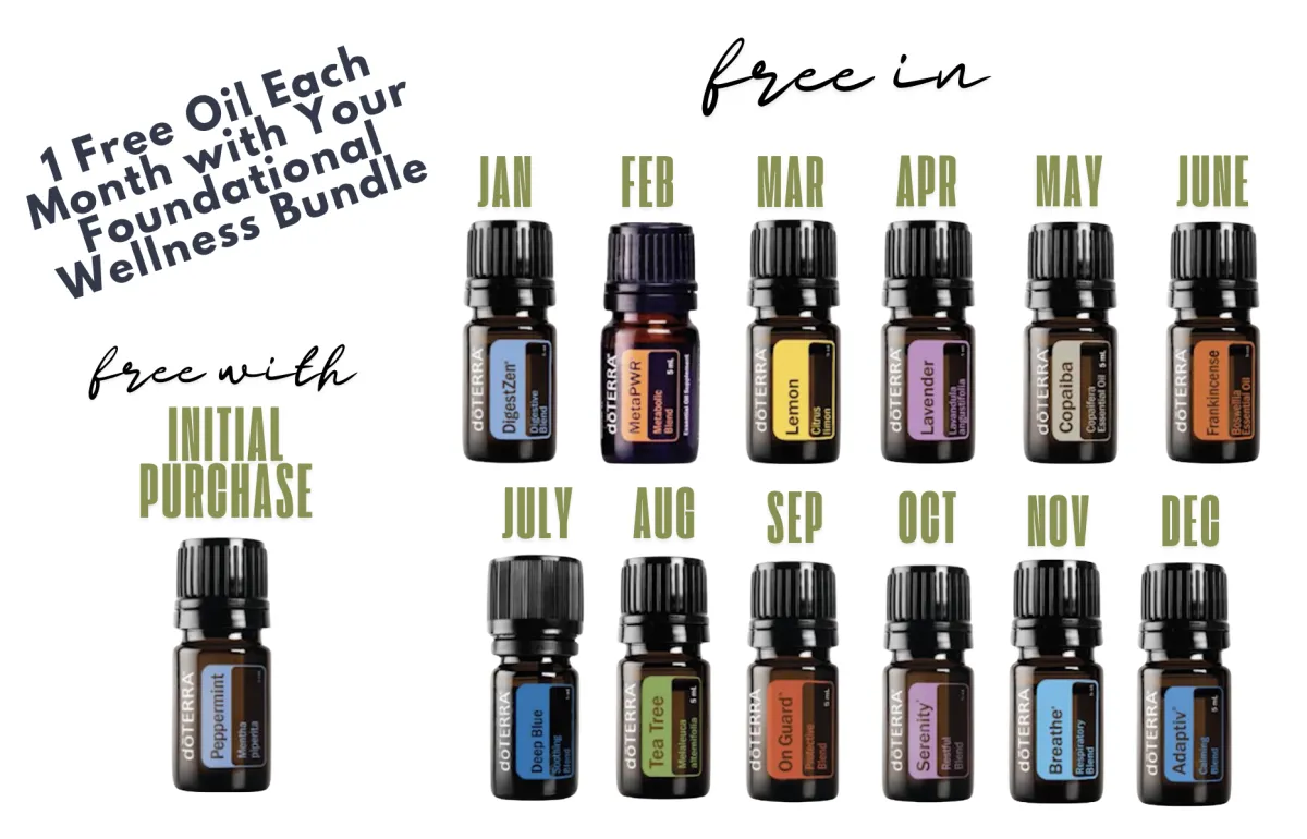 A Complimentary Top 12 Essential Oils (one per month) with your monthly bundle to help stock your wellness cabinet. ($200 value)